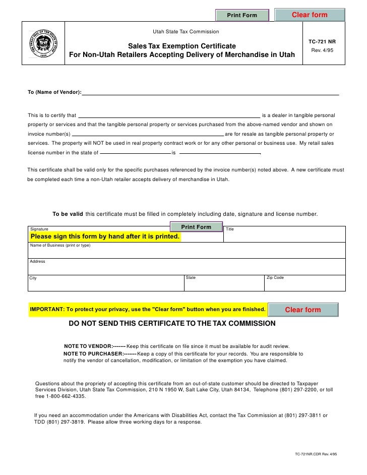 Utah state Tax Commission 210 N 1950 W Salt Lake City, UT 84137 Exemption Certificate (Sales, Use, Tourism and Motor Vehicle Rental Tax) TC-721 ... Access This Document